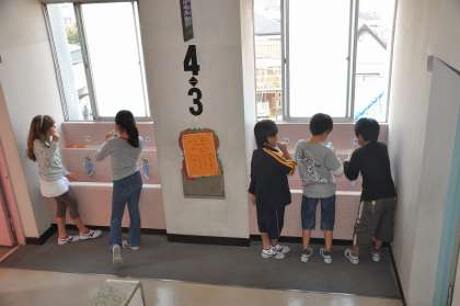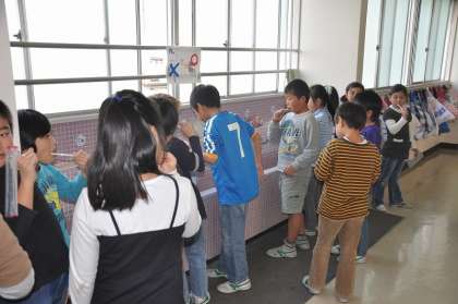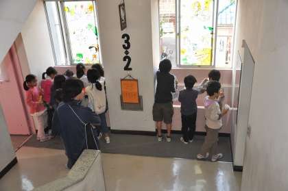 今日から全校で給食後のはみがきを始めました。専科が分担して水飲み場に行き、混乱しないように配慮しました。
