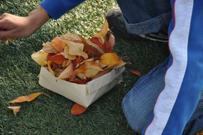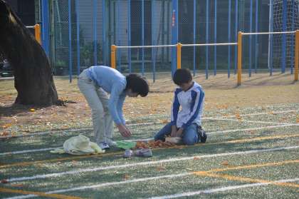 今日も,6年生が人工芝の落ち葉をひろいました。ひろう落ち葉が,日に日に色づきを増しています。