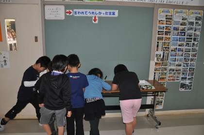 8日の児童朝会で「言われてうれしかったことばをカードに書いて、教えてください」と、子どもたちに投げかけました。すると、休み時間にたくさんの子どもたちが校長室前に置いてあるカードに書き込んでくれています。とてもうれしいです。