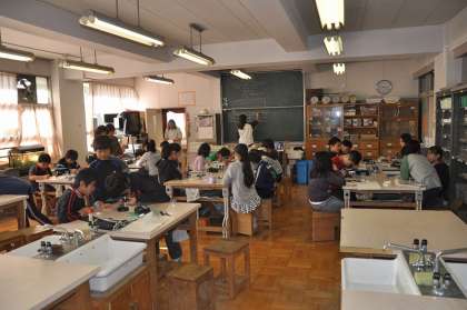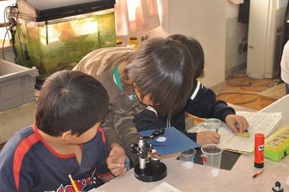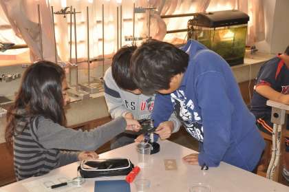 「もののとけ方」で使う食塩とみょうばんの結晶を顕微鏡で観察しています。