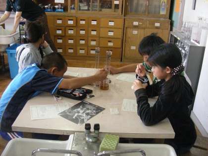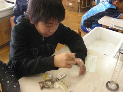 ビーカーに水100mlを入れて固体を入れました。固体は黒砂糖やじゅうそうなど、子どもたちが家から持ってきたものを使いました。