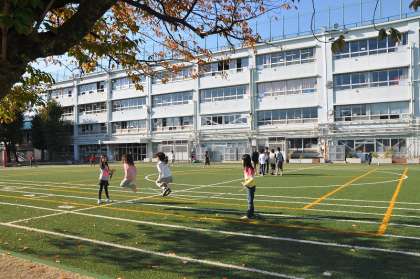 小春日和の中で、たくさんの子どもたちが校庭で遊んでいます。