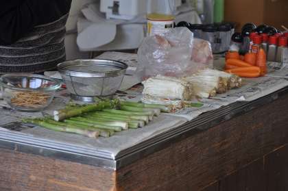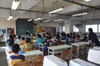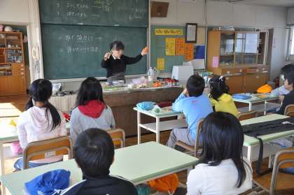 家庭科の調理実習です。まず、作業の確認をしています。ベーコンに巻くのは野菜です。
