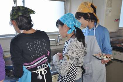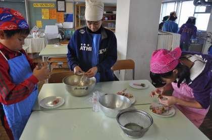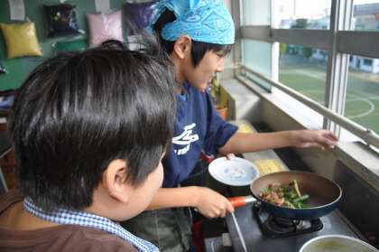 茹でた野菜をベーコンに巻き、フライパンで焼きます。
