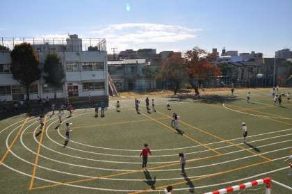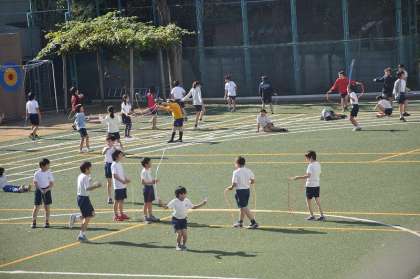 2時間目終了のチャイムが鳴ると、子どもたちは校庭に集まり、なわとびを始めました。