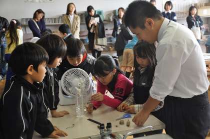 「風の力で、物が持ち上がるか」の実験をしています。