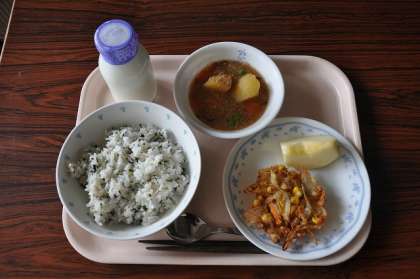 今日のかき揚げに納豆を入れました。その他にタマネギ、ホールコーン、にんじん、ちりめんじゃこ、小麦粉を合わせ、形に丸め油で揚げました。納豆は埼玉県からきました。
