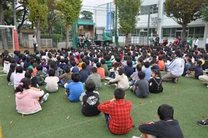 起震車体験を見学しました。震度7で揺れる状況でどのように身を守るか、先生4人の師範を見て学びました。