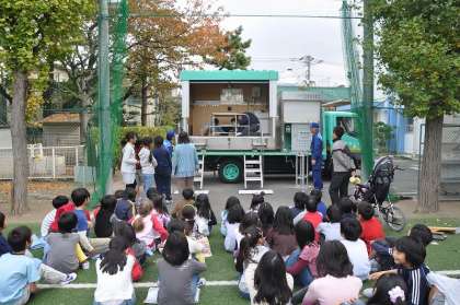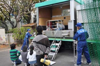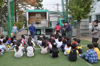 避難訓練のあとで4年生全員が順番に起震車に乗り、震度7の揺れを体験し、身の守り方を学びました。