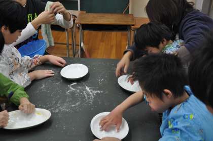 パン粉に接着剤と絵の具を混ぜ、空の色を作りました。それを、模造紙の上でこねることできれいな空ができあがってきました。