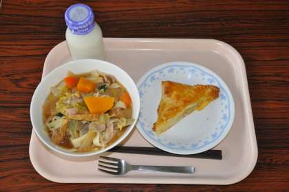 代表的なパイにはミートパイ、アップルパイなどがあります。今日の給食の「リンゴとさつまいものパイ」はリンゴとさつまいもを煮てパイの皮に包んで焼きました。とてもおいしかったです。