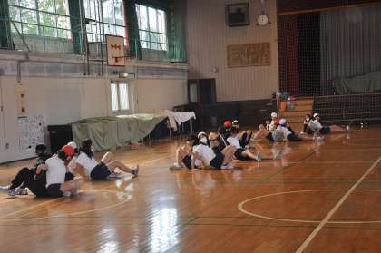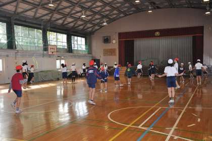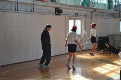 なわとびを使ったり、友だちと協力したりして体力を高める運動に取り組んでいます。健康トレーナーが、授業の支援をしています。