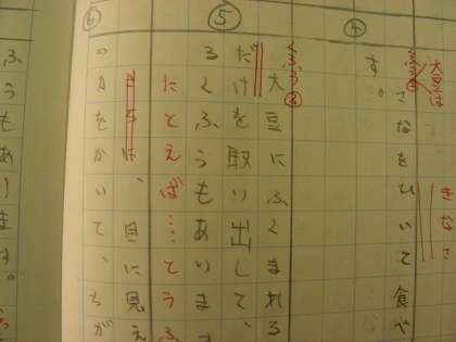 国語、「すがたをかえる大豆」を段落ごとに要点をまとめています。