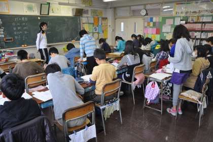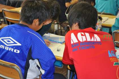 算数の少人数指導です。問題集を使ってまとめの問題を解いています。分からないところは友だちと相談しながら進めています。