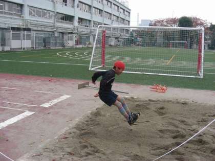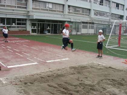 校庭体育で走り幅跳びをしています。