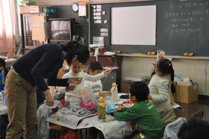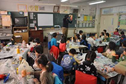 自分たちで作った人形に着せる服を考えています。