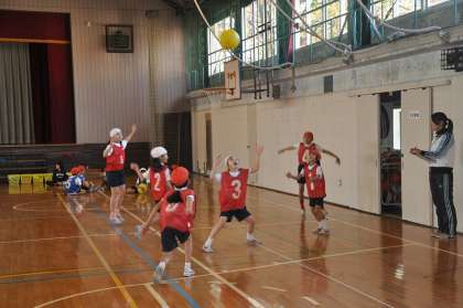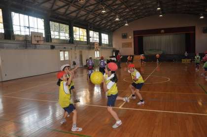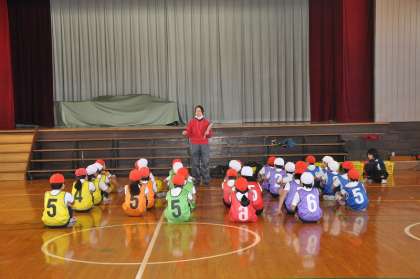 柔らかいボールを使って、チームごとにシュートゲームをしています。
