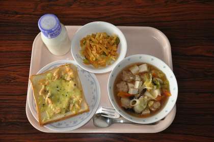 今日の給食は野菜をたくさん使っています。野菜をたくさん食べて、健康に過ごしましょう。