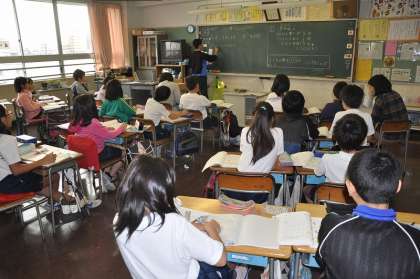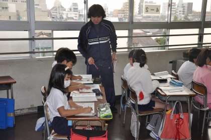 算数の概数の学習です。切り捨てておおよその数を求める問題を解いています。指導はTTで進めています。