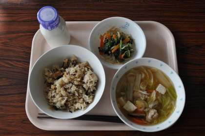 ひじきご飯のひじきは北海道から九州までの沿岸に多く育つそうです。乾燥したひじきを戻して味をつけて、ごはんにいれました。カルシウムや鉄分が多く含まれています。ひじきは鹿児島県からきたものです。ひじき以外の具も盛りだくさんでおいしかったです。