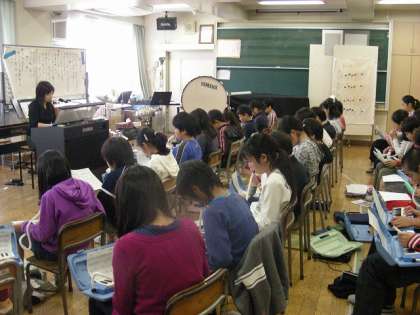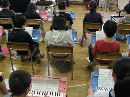 鍵盤ハーモニカを使って「旅立ちに日に」を練習しています。