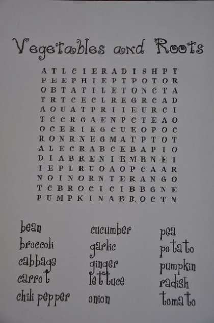 上のアルファベットのかたまりから、下のに表記してある単語の固まりを探していす。