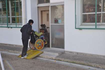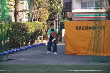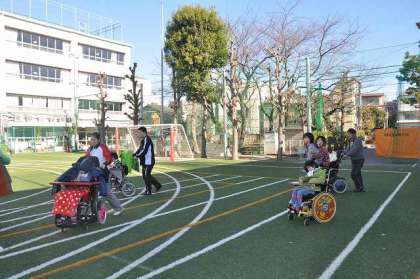 避難訓練の放送があったので、校庭の避難場所に向かっています。