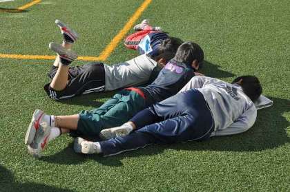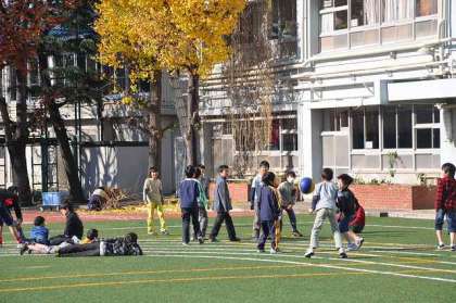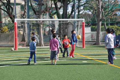 避難訓練終了後の中休みは、元気に遊んでいました。人工芝があたたかいので、寝そべって話をしている子どもたちもいました。