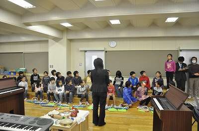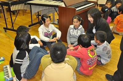 グループごとにめあてをもって練習した成果の発表です。前担任のナレーションに合わせ、自分のグループの分担の部分を切れ目なく順番に演奏しました。演奏した後は、各グループで反省をし、全体の前で発表した後、次の時間の学習内容を確認しました。(この授業は校内研究授業としておこなわれました。)