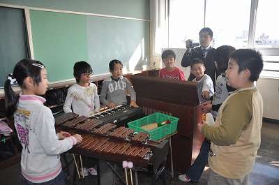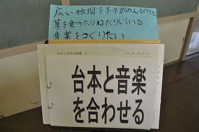 グループごとに決めた牧場の子牛の物語の部分の曲を練習しました。4つのグループに分かれ、それぞれ自分たちでめあてをもって練習に取り組みました。表示はある班のめあてです。