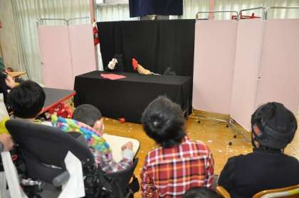 次は、人形劇です。うさぎさんとくまさんが色に関係するお話をしてくれました。最後に風船を飛ばしてみんなにプレゼントをしました。