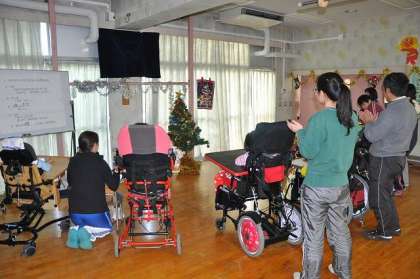 お楽しみ会が始まりました。はじめのことばのあとで、サンタさんとトナカイさんを待っています。