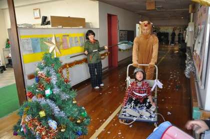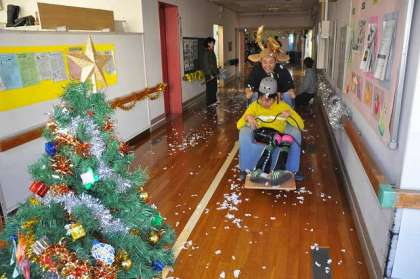 ソリリレーです。一人一人がそりに乗って、ツリーで折り返して戻ります。ツリーの根元にあるプレゼントを一人一つずつ持ち帰ります。