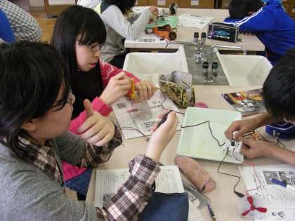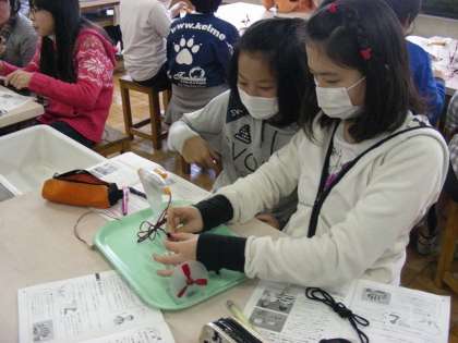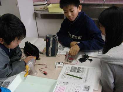 コンデンサーに電気をためました。手回し発電機を使いました。