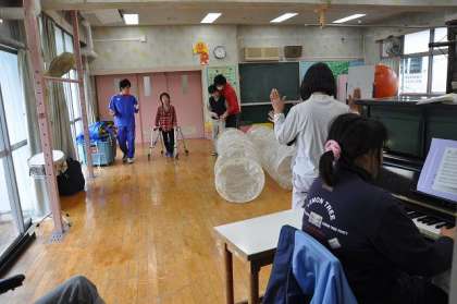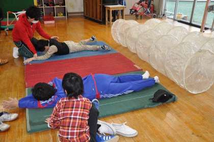 音楽に合わせて、歩く、お馬さん、転がる運動をしました。、