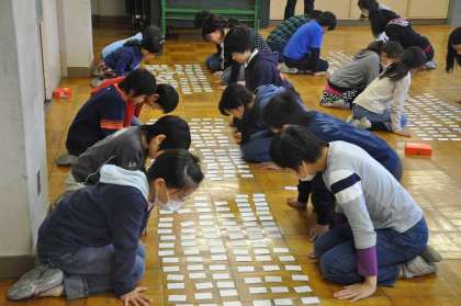 3年生対6年生で百人一首をやりました。どのグループも緊張感のある白熱したゲームになりました。