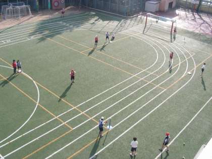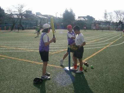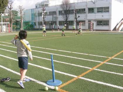 練習後は試合をしました。5年生では野球やソフトボールと同じようにベースをダイヤモンドのようにおいてゲームを行っています。