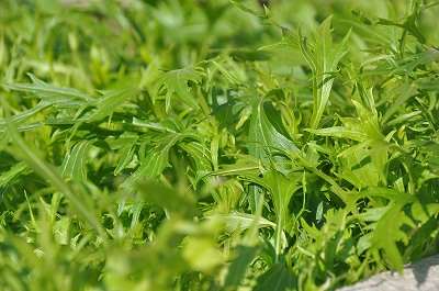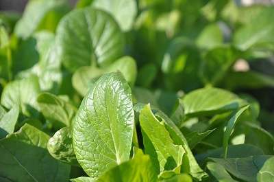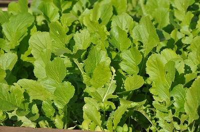 冬の日差しを浴びて、小松菜、水菜、葉大根などの野菜が育っています。