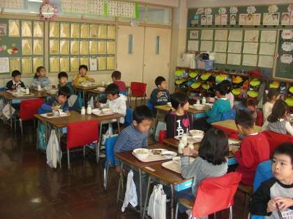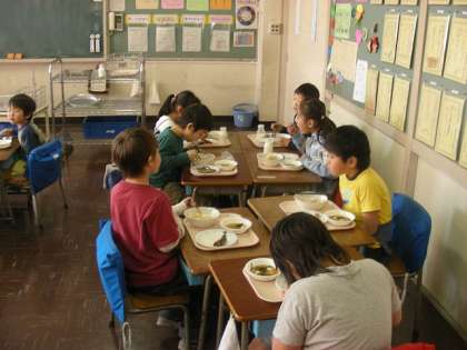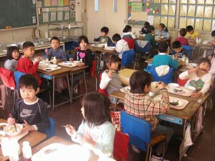 班で給食を食べています。よく噛んで食べていました。