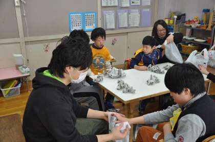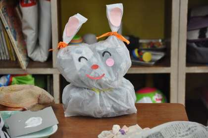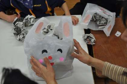 新聞紙の詰め方で、いろいろな表情のうさぎができます。やせていたり、ふくよかだったり…。
