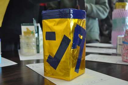 不要品の活用としてペットボトルや牛乳パックなどを使ったリサイクルの作品ができあがってきました。