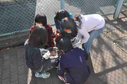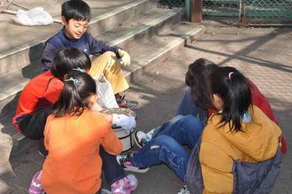 これまで教室で学習してきた七輪を実際に使います。まず火をおこす準備からです。