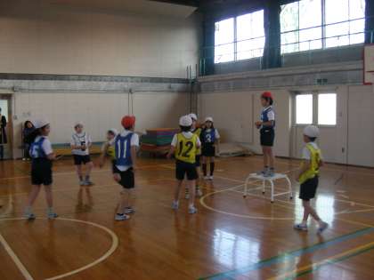 ポートボールをしています。ポートボールとはバスケットボール型のゲームで、バスケットゴールの代わりにゴールマンが台の上に乗り、ボールをキャッチしたら点が入ります。人数やコートの広さなど、正式なルールと少し変えて行っています。