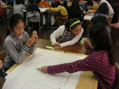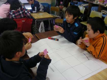 グループワークトレーニングとは、グループで協力して問題を解決していく学習です。今日のめあては、「友達の情報をよく聞く。」「自分の情報をわかりやすく伝える。」「グループで協力する。」の3つです。