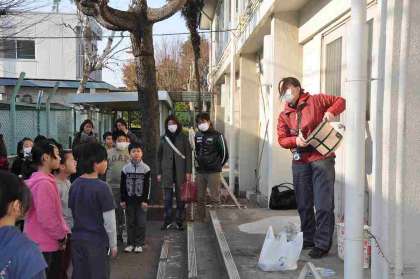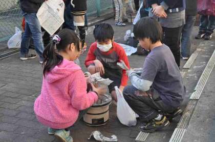 これまで学習してきた七輪を、今日は実際に使います。まず、七輪の使い方や火をおこす順番などを確認しました。そのあとで、作業に取りかかりました。