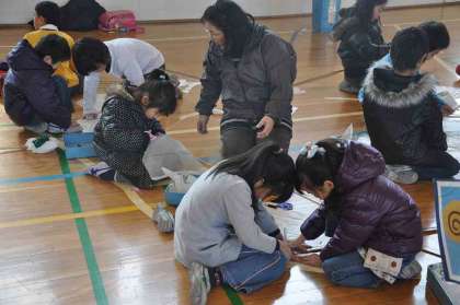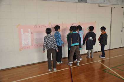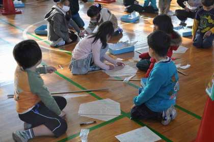 2年生が1年生に作り方を教えています。分からなくなると、壁に貼ってある資料を見て確認します。