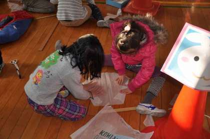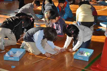 担任の指導も受けながら、たこ作りをしています。