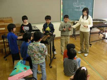 楽器を使って、子どもたち自ら考えて木の実の音を表現しています。