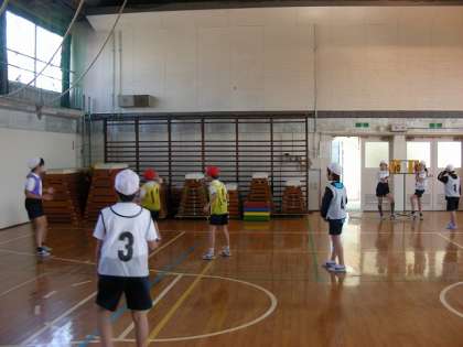 ポートボールをしています。ポートボールとはバスケットボール型のゲームで、バスケットゴールの代わりにゴールマンが台の上に乗り、ボールをキャッチしたら点が入ります。人数やコートの広さなど、正式なルールと少し変えて行っています。