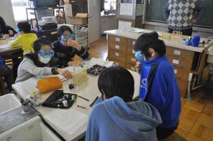 水酸化ナトリウム使用のため、保護眼鏡を付けて実験しています。